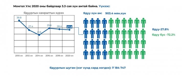Үндэсний статистикийн хорооноос хоёр жил тутам ядуурлын түвшинг тодорхойлох судалгаа хийж танилцуулдаг. Тэгвэл ҮСХ-ноос хийсэн 2020 оны ядуурлын түвшнийг тооцоолсон судалгаагаар Монгол Улсын арван иргэн тутмын дөрөв нь ядуу амьдарч байна. Ядуурлын түвшинг тооцохдоо нэг хүнд сард ногдох суурь хэрэглээний түвшинг 184 мянган төгрөгөөр тооцож үүнээс доош хэрэглээтэй хүн амыг ядуу гэж үздэг. Тодруулбал, нийт хүн амын 27.8 хувь буюу 903.4 мянган хүн ядуу гэсэн дүн гарчээ.