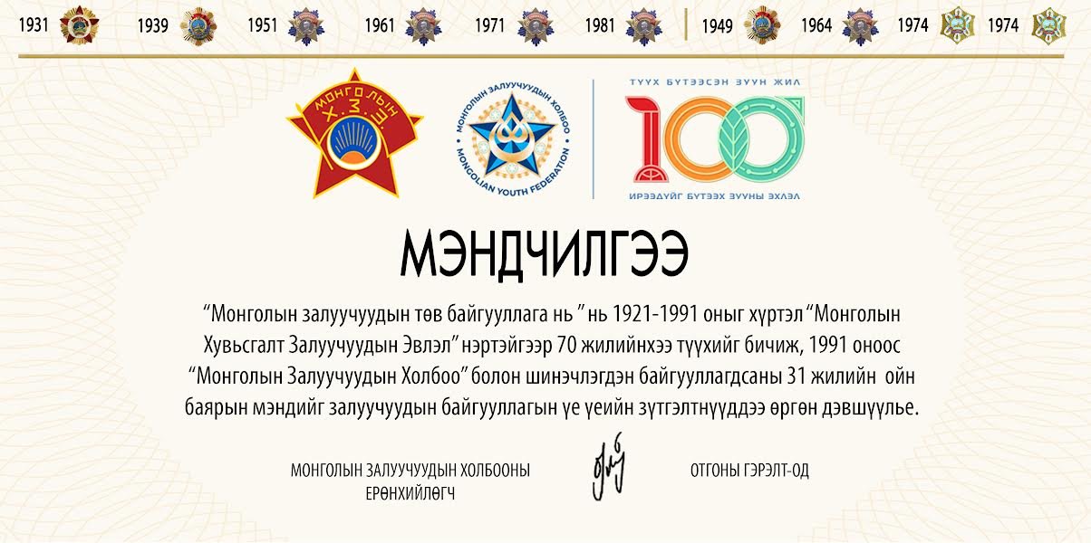 "Монголын Залуучуудын Холбоо" 1991 оныг хүртэл ‘Монголын Хувьсгалт Залуучуудын Эвлэл’ нэртэйгээр 70 жилийнхээ түүхийг бичиж, социалист нийгмийн сор нь болон гялалзаж явсан юм. Харин 1990 гарч Монгол оронд ардчилал шинэчлэлийн салхи сэвэлзэхтэй зэрэгцэн 1991 оноос хуучин нэрээ халж ”Монголын Залуучуудын Холбоо” болон төвхнөсөн билээ. Тэрхүү цаг мөчөөс хойш эдүгээ 31 дэх жилийнхээ нүүрийг үзэж, шинэ нийгмийн шинэлэг залуусын түүчээ болон урагшилсаар байна. Ингээд ”Монголын Залуучуудын Холбоо” орчин цагийн шинэ бодлого төлөвлөлттэйгээр үйл ажиллагаагаа явуулж эхэлсний 31 жилийн ойн баярын мэндийг ”Монголын Хувьсгалт залуучуудын эвлэл”-ийн үе үеийн ахмад буурлууд, хувьсгалт залуучуудын эвлэлээс ”Монголын залуучуудын холбоо”-нд шилжин ажилласан залуучуудын байгууллагын үе, үеийн зүтгэлтнүүд, бидэнтэй нэгэн цагт хамтран зүтгэж байгаа журмын нөхдөдөө өргөн дэвшүүлье. Та бүгдийн ажил үйлс арвижин дэлгэрэх болтугай.