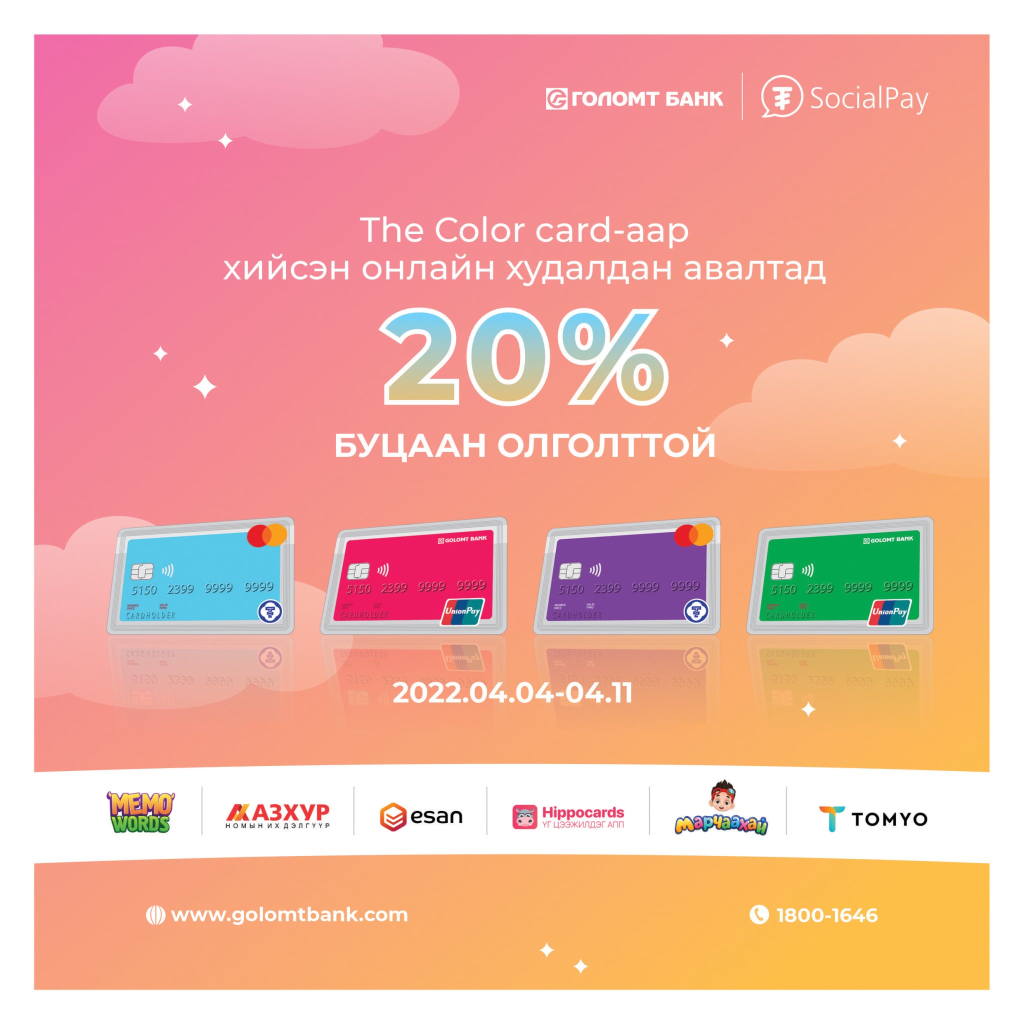 The Color Card сурагчдын амралтад зориулан буцаан олголттой урамшуулалт хөтөлбөрийг зарлаж байна. The Color Card-ийн эрхэм харилцагч та картаа ашиглан дараах сонгогдсон вэбсайтуудаас онлайнаар худалдан авалт хийж 20%-ийн буцаан олголт авах боломжтой боллоо.
